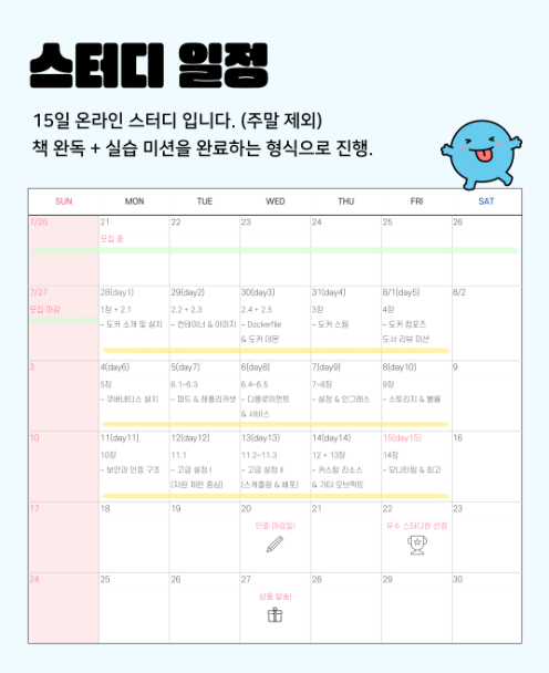 “7월 28일부터 도커/쿠버네티스 스터디를 시작했다. 총 15일 동안 진행되는 3주 과정이었다."